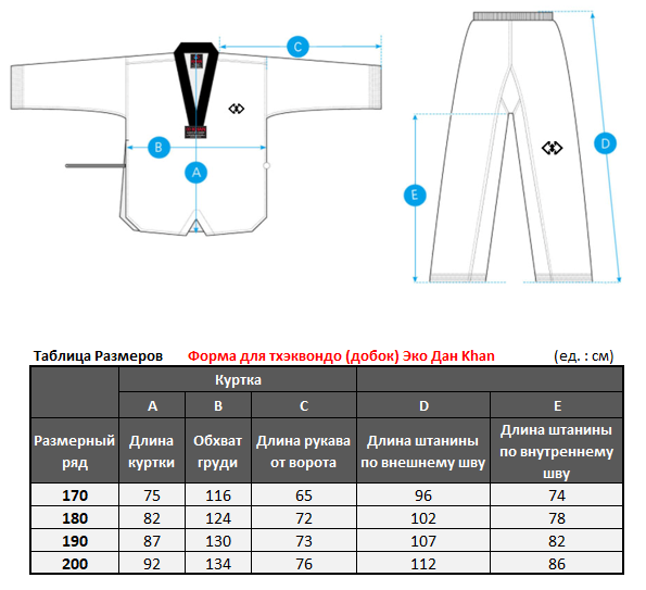 Форма для тхэквондо (добок) Эко Дан Khan Изготовлен добок из 80% полиэстера и 20% хлопка. Материал очень легкий, рельефный и с уникальным плетением. Плотность ткани всего 8 унций, однако износостойкость отличная. Кимоно не вытягивается, не мнется, во время занятий меньше прилипает к телу, обеспечивая спортсмену максимальный комфорт и удобство.Куртка с V-образным вырезом и воротником черного цвета. Брюки очень просторные, составные, удерживаются благодаря широкой резинке.Размерный ряд: 170-200 см.Пояс не входит в комплект