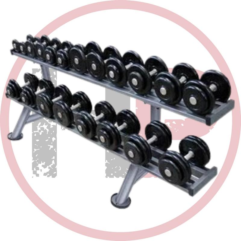 Набор неразборных обрезиненных гантелей на двухрядном стеллаже длиной 310 см. Гантели составлены из обрезиненных дисков Антат, ручки вращающиеся хромированные. Надежное крепление дисков на грифах обеспечивает полную безопасность и комфорт тренировок.