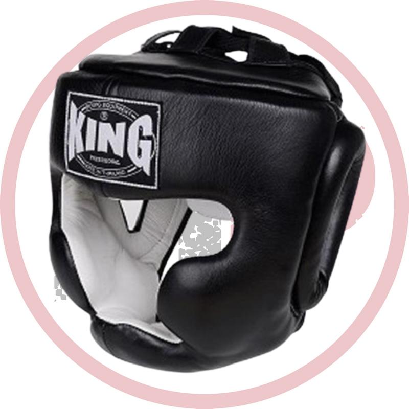 Шлем KING - тренировочный закрытый боксерский шлем. Усиленная защита в области щек, ушей и подбородка. Надежно защищает лицо от повреждений. В таком шлеме выступать на соревнованиях НЕ разрешается.